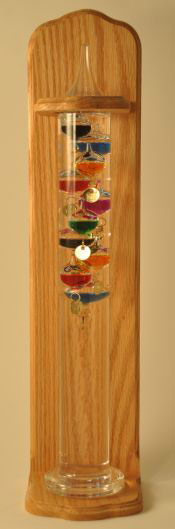 The Galileo Thermometer is a very unique thermometer that allows you to tell room temperatures (in degrees Fahrenheit) in a very attractive, unusual manner. The thermometer is a sealed glass tube containing a liquid and several glass spheres, each having a brass plate with a temperature inscribed on it. The brass plates provide different weights for the individual spheres so that as the density of the liquid in the tube changes with temperature change, each sphere will react to the density change by either sinking or floating in the tube. As the temperature goes up, the density of the fluid goes down and the spheres sink at a rate determined by their mass. As it goes down, the fluid density increases and they float, again dependent on their mass. Since each sphere is weighted differently (different mass), they will sink or float at different temperatures. In order to tell what the temperature is, simply look at the brass plate on the sphere at the bottom of the floating spheres. The temperature that is shown is the room temperature. As seen below, the room temperature for this thermometer was 66 degrees Fahrenheit.