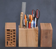 The "Store 'N Find" can hold 6 pairs of scissors and 12 round items, such as marking pens, pencils, seam rippers, thread pics, etc. It also has a slot to hold rulers. The "Store 'N Find" is made from hardwood and is well-balanced and heavy enough that it won't easily tip. Note from the photos that the bottom is solid so that any items placed into its slots will not scratch a work surface upon which the case sits. The photo at the right depicts one of the ways in which I organize the holes in the unit. Most now have the several round holes and two long holes on the left. I've found that this configuration works best for all of the various doodads that quilters use. If the configuration of holes is an issue, let me know and I can make one with your needs in mind.